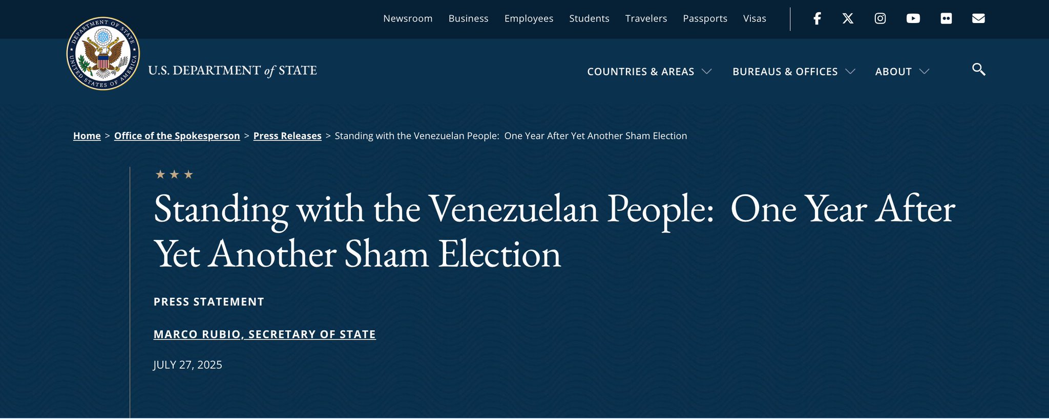 Declaración de Prensa Marco Rubio, Secretario de Estado 27 de julio de 2025.