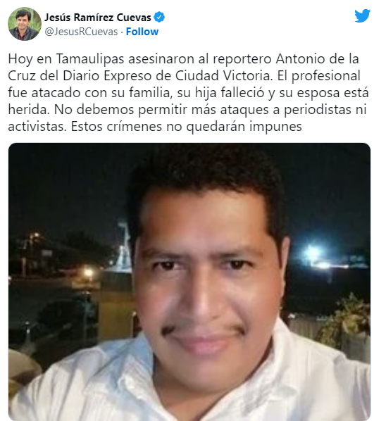 Colegas de De la Cruz señalaron que desconocen si el periodista había recibido amenazas. La última nota que publicó fue sobre las altas temperaturas que se registraron el martes en Tamaulipas.