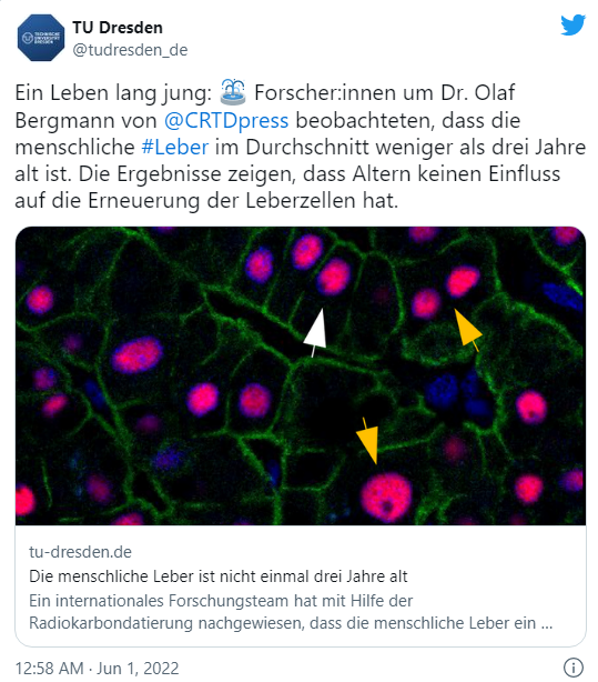 Un grupo de investigadores de la Universidad Técnica (TU) de Dresden (este de Alemania) ha evidenciado que no importa la edad de la persona; el hígado siempre tiene menos de tres años, por lo que es un órgano que repone sus células tanto en personas jóvenes como adultas, según el estudio publicado el martes (31.05.2022) por la revista Cell Systems.