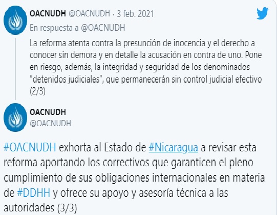La Oficina del Alto Comisionado de las Naciones Unidas para los Derechos Humanos (OACNUDH) dio a conocer este miércoles su valoración sobre la reforma del Código Procesal Penal aprobada en Nicaragua, la cual afirma es «contraria a la Constitución y los estándares internacionales».