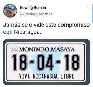 Mientras el padre Edwin Román, párroco de la Iglesia San Miguel Arcángel de Masaya, resalto: ´´Jamás se olvida este compromiso con Nicaragua´´. acompañado con una placa de vehículo y la fecha 18-04-18, VIVA NICARAGUA LIBRE´´.