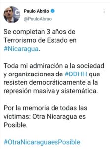 3 años de Terrorismo de Estado en #Nicaragua.Toda mi admiración a la sociedad y organizaciones de #DDHH que resisten democráticamente a la represión masiva y sistemática.