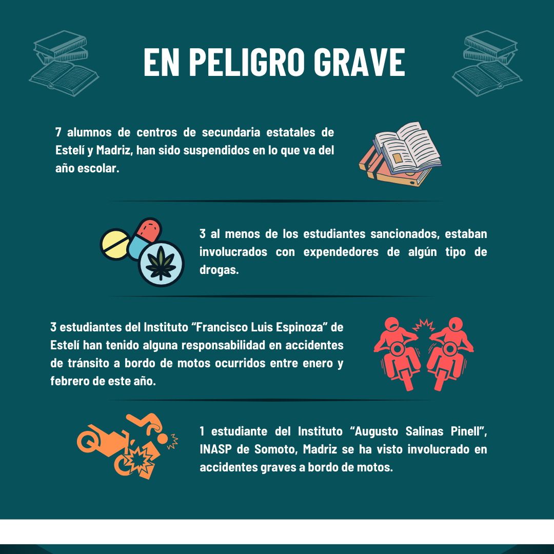 Otra preocupación la causó el reporte ese año de dos casos de suicidios de jóvenes; uno ocurrió en Estelí y el otro en Somoto. Estudiantes que conocieron de las tragedias, dijeron que ambos estaban ligados al consumo de sustancias prohibidas.