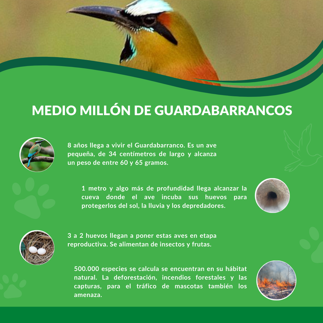 “En el mes de abril se puede escuchar su canto, aunque no es muy bonito, sin embargo, uno de los nombres comunes del Guardabarranco que recibe en Costa Rica es el: Torogoz porque su canto, suena como ¡torogoz! ¡torogoz! ¡torogoz! cuando busca conquistar a su pareja, durante este periodo que caminan en comunidad para protegerse”, explica Morales.