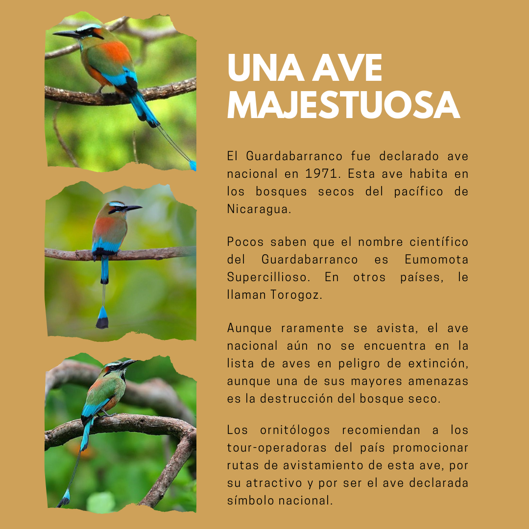 “Esta ave busca los barrancos de piedra pómez, porque es una tierra suave, para construir con su fino pico su casa, y de ahí adopta el nombre de Guardabarranco, porque se guarda en estos peñascos”, enfatiza Morales.