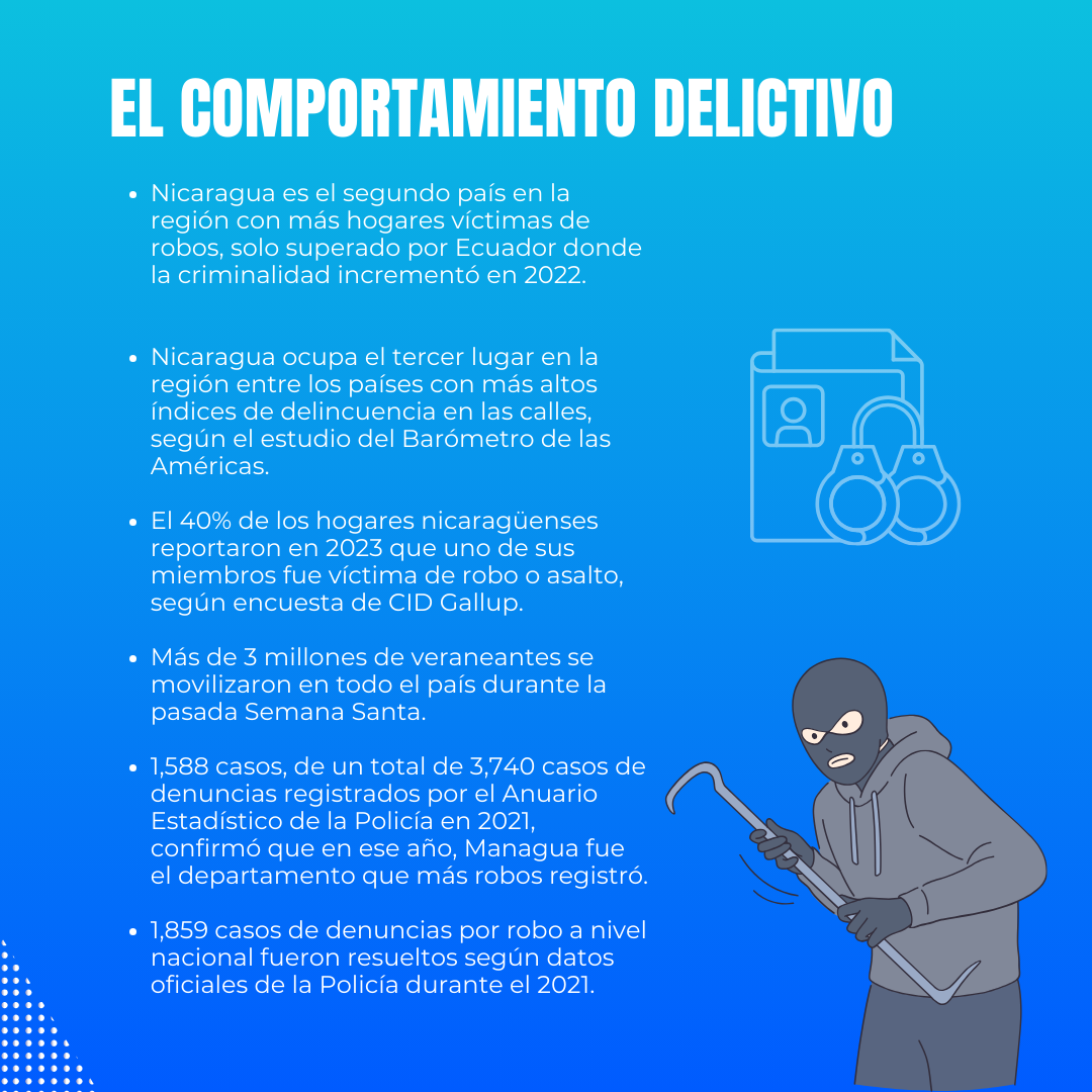 No obstante, una encuesta de la firma investigadora CID Gallup, reveló que entre los últimos meses de 2022 y los primeros de 2023, Nicaragua se colocó en el primer país a nivel centroamericano con los índices más altos en robos o asaltos.