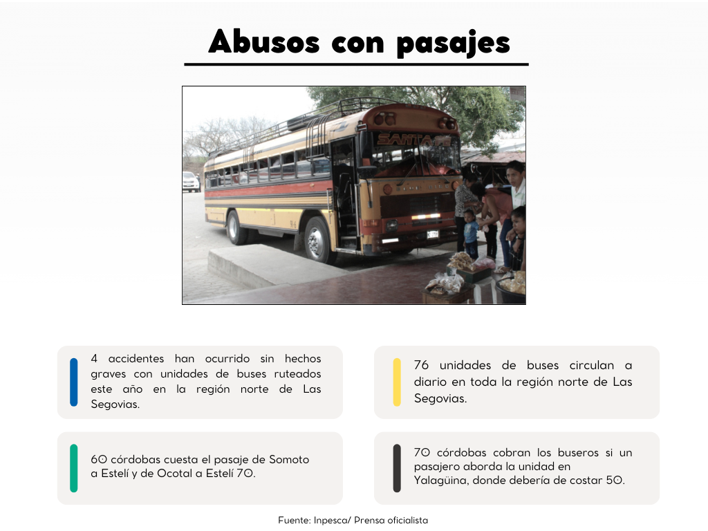 En el municipio de Palacagüina, zona del departamento de Madriz, por donde pasan muchas de las unidades que van de Estelí a las ciudades de Ocotal y Somoto, los conductores no cumplen con las paradas. “La gente se queja botada, aunque pasen vacíos no se detienen a montarlo a uno”, se quejó doña Consuelo Hernández, comerciante de rosquillas en esta localidad.