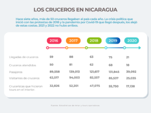 Para el economista Marco Aurelio Peña, las protestas iniciadas en abril como parte de un descontento social contra el régimen de Daniel Ortega y Rosario Murillo, quien respondió con violencia, generó un declive significativo en la llegada de cruceros al Puerto de San Juan del Sur. “Mientras la situación en el país no cambie, las condiciones para su regreso no caben. Se está restringiendo cada vez más el nivel macroeconómico. Al gobierno actual y a las empresas como tal regidas por la pareja dictatorial, les han llovido sanciones, repercutiendo de manera directa al sector turismo”, dijo el especialista.