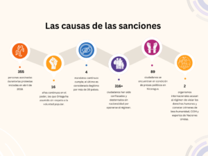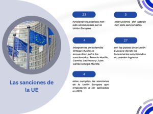Las sanciones impuestas por la Unión Europeo, (UE), se extienden desde entidades gubernamentales, pasando por funcionarios estatales y llegan a miembros de la familia de régimen de Nicaragua que pesan por ser responsables de graves violaciones de los derechos humanos, elecciones fraudulentas, socavamiento de la democracia y el Estado de Derecho.