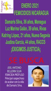 Hasta el momento las autoridades policiales buscan a Joel Antonio Bellorín Silva, quien es el principal sospecho de uno de los femicidios en Nicaragua específicamente de Damaris Silva habitante del barrio San Judas de Managua, el pasado primero de enero..
