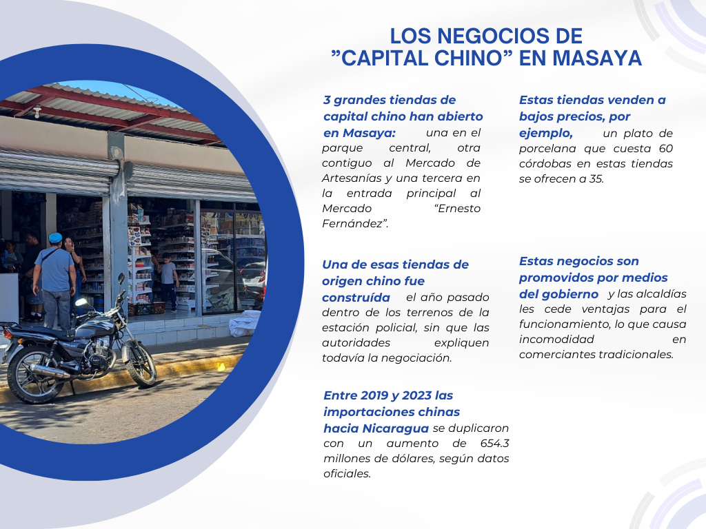 El negocio del que habla Salgado, es una de las tiendas chinas más vistosas de Masaya. El local podría alcanzar los 10 metros de largo por seis de ancho. Se construyó en la acera trasera de la estación de Policía, dónde antes se ubicaban negocios informales como vendedores de frutas, comidas, bebidas y de mascarillas.