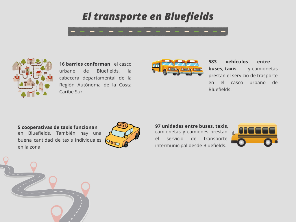 En Bluefields, la ciudad puerto de entrada de la Costa Caribe sur del país, no hay unidades de transporte colectivo, la población que lo necesita por vivir en el casco urbano y en la periferia del municipio, está en manos de taxistas cooperados e individuales y otro tipo de vehículos particulares como camionetas.