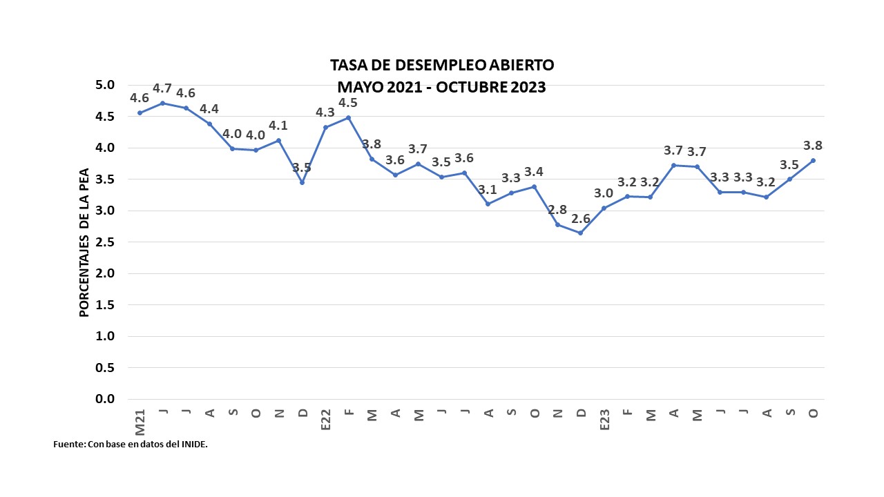 Según el informe del INDE en diciembre 2023, la tasa neta de ocupación a nivel nacional fue 97.5 por ciento mientras que en el 2022 se marca un 97.4% hasta diciembre, el informe señala que para el área urbana fue de 96.8 por ciento y (95.7% en Managua), y de 98.5 por ciento en el área rural, es decir que a nivel nacional hay un total 97.1 por ciento, según el informe del régimen de la tasa de ocupación (población en edad laboral más empleados).