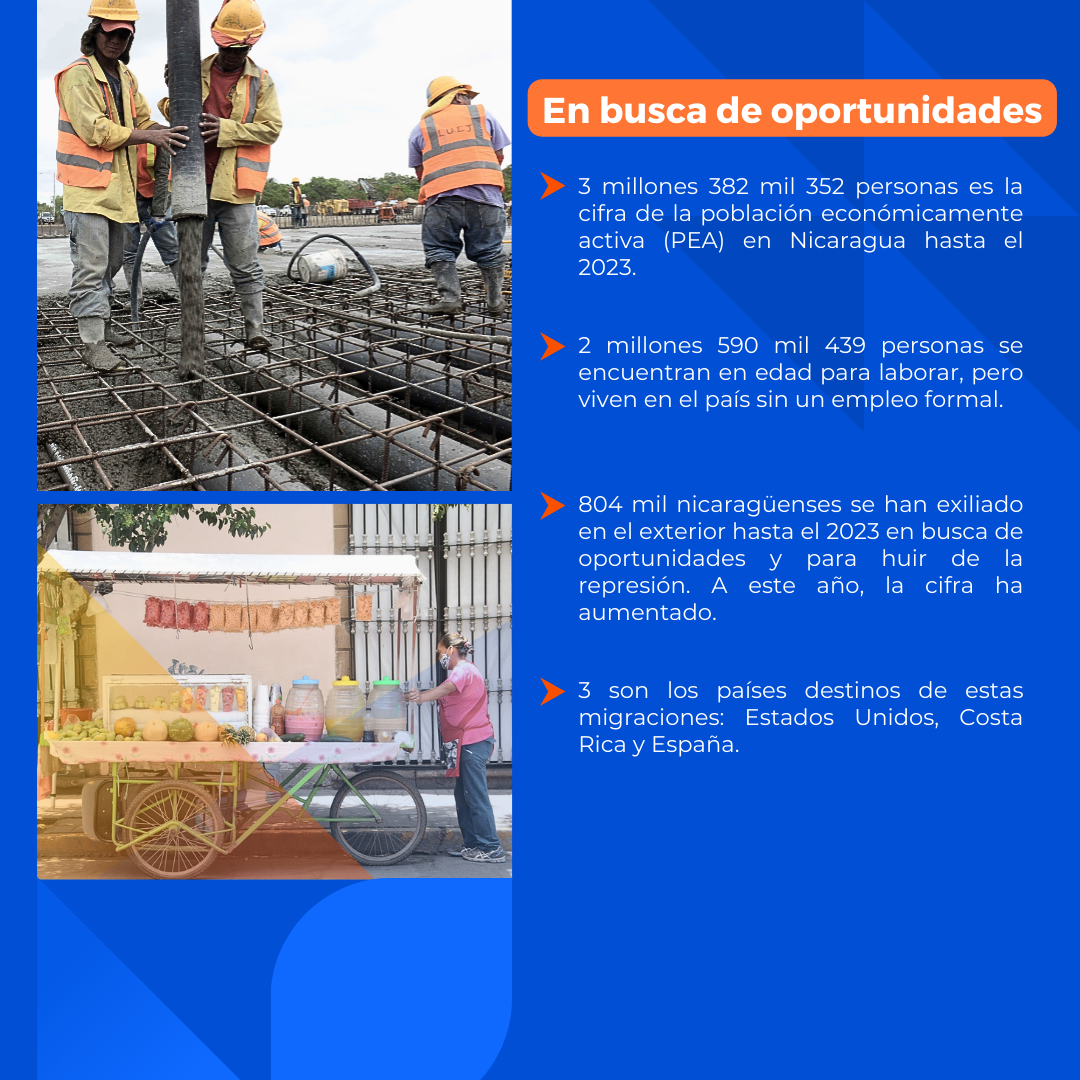 Lo que indica que en el país hay 2.590,439 sin empleo formal, esta situación ha obligado a los miles de nicaragüenses a emigrar, a Costa Rica, Estados Unidos o Europa por la falta de empleos y de oportunidades.