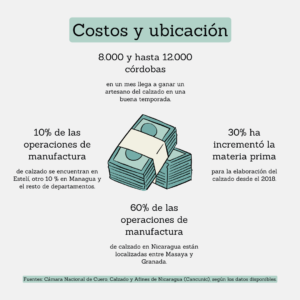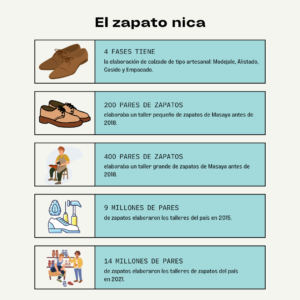 El humilde artesano de 48 años de edad y dueño de su taller que aún no cuenta con una marca, narra que sus colaboradores pasan días en la elaboración del calzado como uno de los oficios más rentables para la población de Masaya, uno de los departamentos más pequeños del país. Solo en 2015, Nicaragua registró una producción récord de nueve millones de pares de zapatos, lo que generó ingresos por 50 millones de dólares. Para 2021, la producción de calzado a nivel nacional incrementó hasta 14 millones de pares.