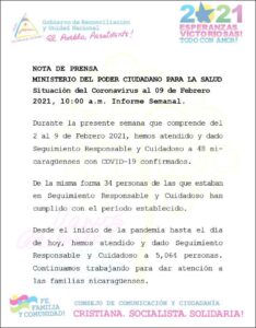 ´´Durante la presente semana que comprende del 2 al 09 de febrero 2021, hemos atendido y dado Seguimiento Responsable y Cuidadoso a 48 nicaragüenses con COVID-19 confirmados.