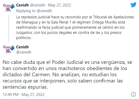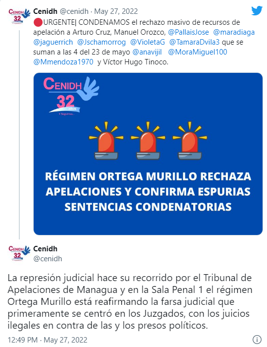 «En los Tribunales de Apelaciones han sido declaradas sin lugar las apelaciones, confirmando las injustas sentencias condenatorias”, informó el Cenidh, que calificó la decisión de la Justicia nicaragüense de «farsa y persecución judicial”.