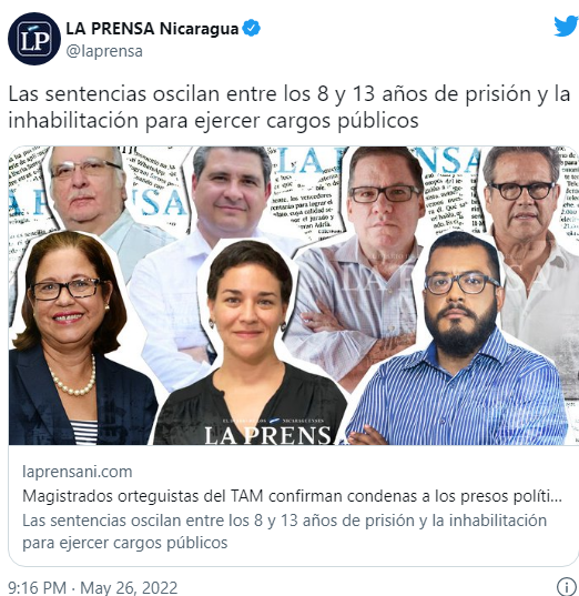Las condenas ratificadas son las de los exaspirantes a la Presidencia Arturo Cruz, Félix Maradiaga, Juan Sebastián Chamorro y Miguel Mora, los exvicecancilleres José Pallais y Víctor Hugo Tinoco, las líderes opositoras Ana Margarita Vijil, Tamara Dávila y Violeta Granera, los dirigentes campesinos Medardo Mairena y Pedro Mena, el empresario José Adán Aguerri y el periodista deportivo Miguel Mendoza.