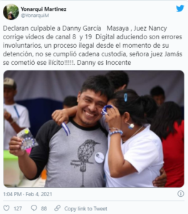 «Juez Nancy, corrige videos de canal 8 y 19 Digital aduciendo que son errores involuntarios, un proceso ilegal desde el momento de su detención, no se cumplió cadena de custodia, ¡señora juez Jamás se cometió ese ilícito! Danny es Inocente” expresó Martínez en su cuenta de Twitter.