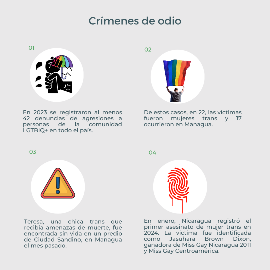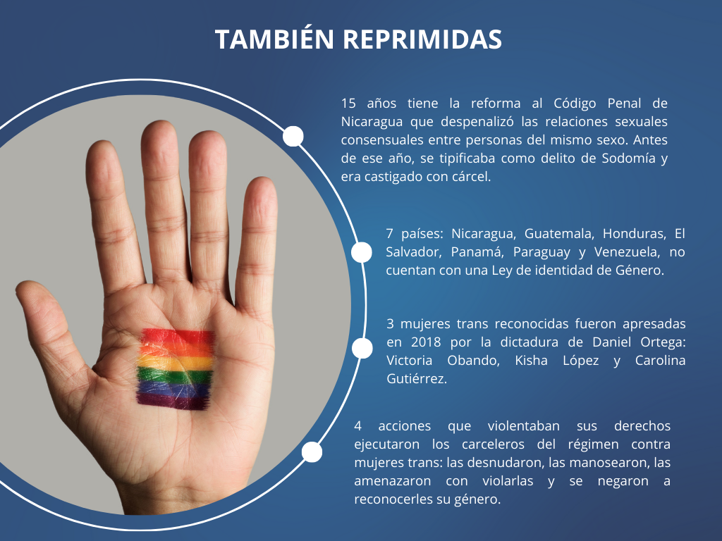 Después de aplastar las manifestaciones ciudadanas  con armas de grueso calibre y escuadrones de muerte, el régimen de Ortega, se encargó de aniquilar los “avances” en materia de derechos de la comunidad LGBTIQ+ en Nicaragua. A ellos se les negó las manifestaciones propias de su agenda, les negaron el permiso para celebrar el Día del Orgullo Gay y ordenaron secuestros, cárcel y juicios espurios a mujeres trans reconocidas por su activismo político y social.