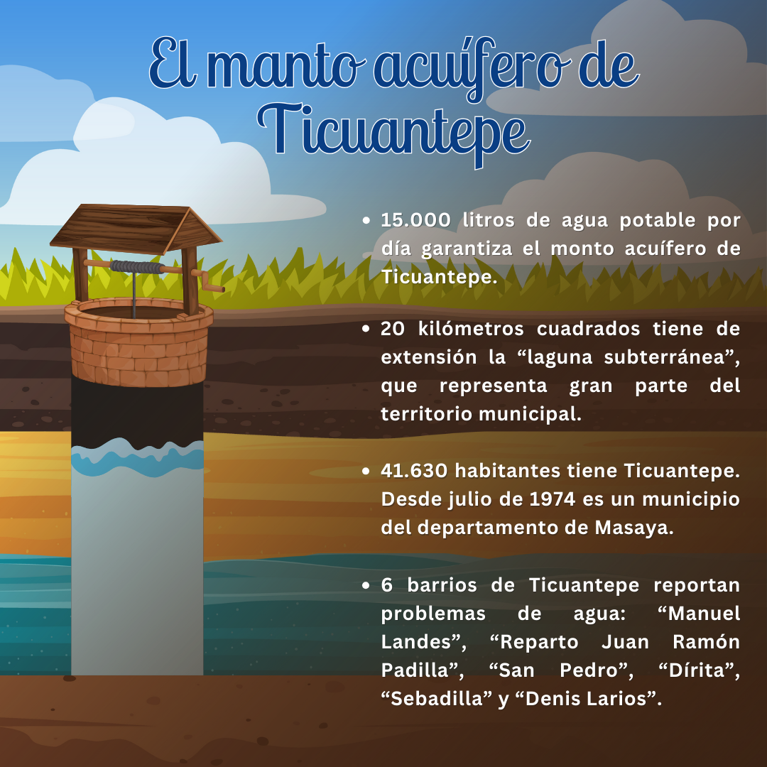 Ticuantepe es dueño de una enorme riqueza hídrica en la que se encuentra una “laguna subterránea” con una extensión aproximada de 20 kilómetros cuadrados y que cubre gran parte del territorio municipal. Además, Ticuantepe es dueño de la reserva “El Chocoyero-El Brujo”, un lugar turístico que administra el Instituto Nicaragüense de Turismo, Intur, y el gobierno municipal y que garantiza 15 mil litros de agua por día apta para el consumo humano.