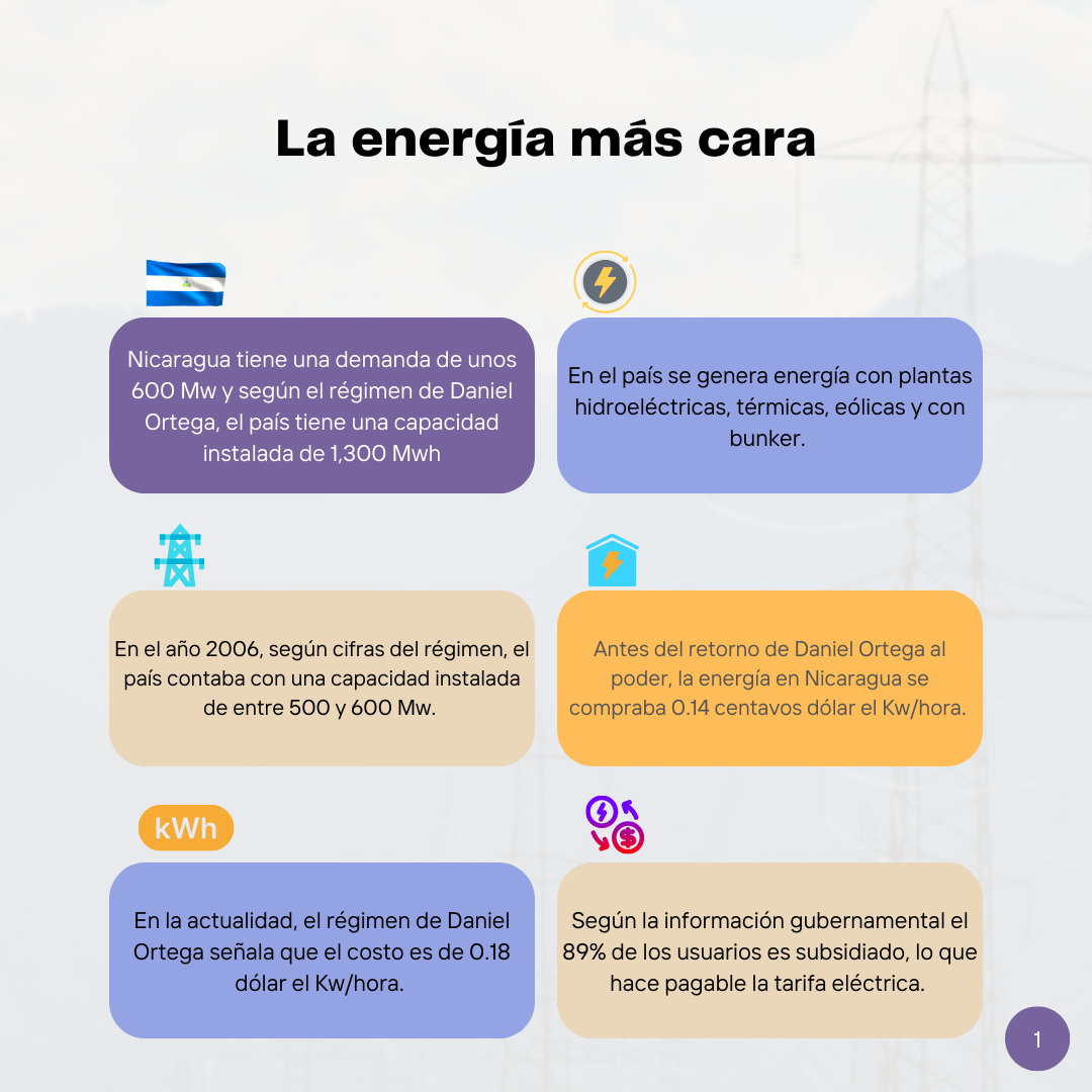 Los medios de comunicación del régimen que son administrados por los hijos de Ortega y Murillo, repiten con frecuencia que en los últimos años, Nicaragua ha dado un salto significativo en la generación de energía. Sin embargo, para muchos nicaragüenses, este supuesto progreso no se refleja en sus bolsillos. “Aquí la luz es cara”, dice don Marcos, un capitalino que cada vez y cuando, debe ir a las oficinas de la distribuidora de energía para hacer algún acuerdo de pago y evitar así que le corten el servicio de energía.