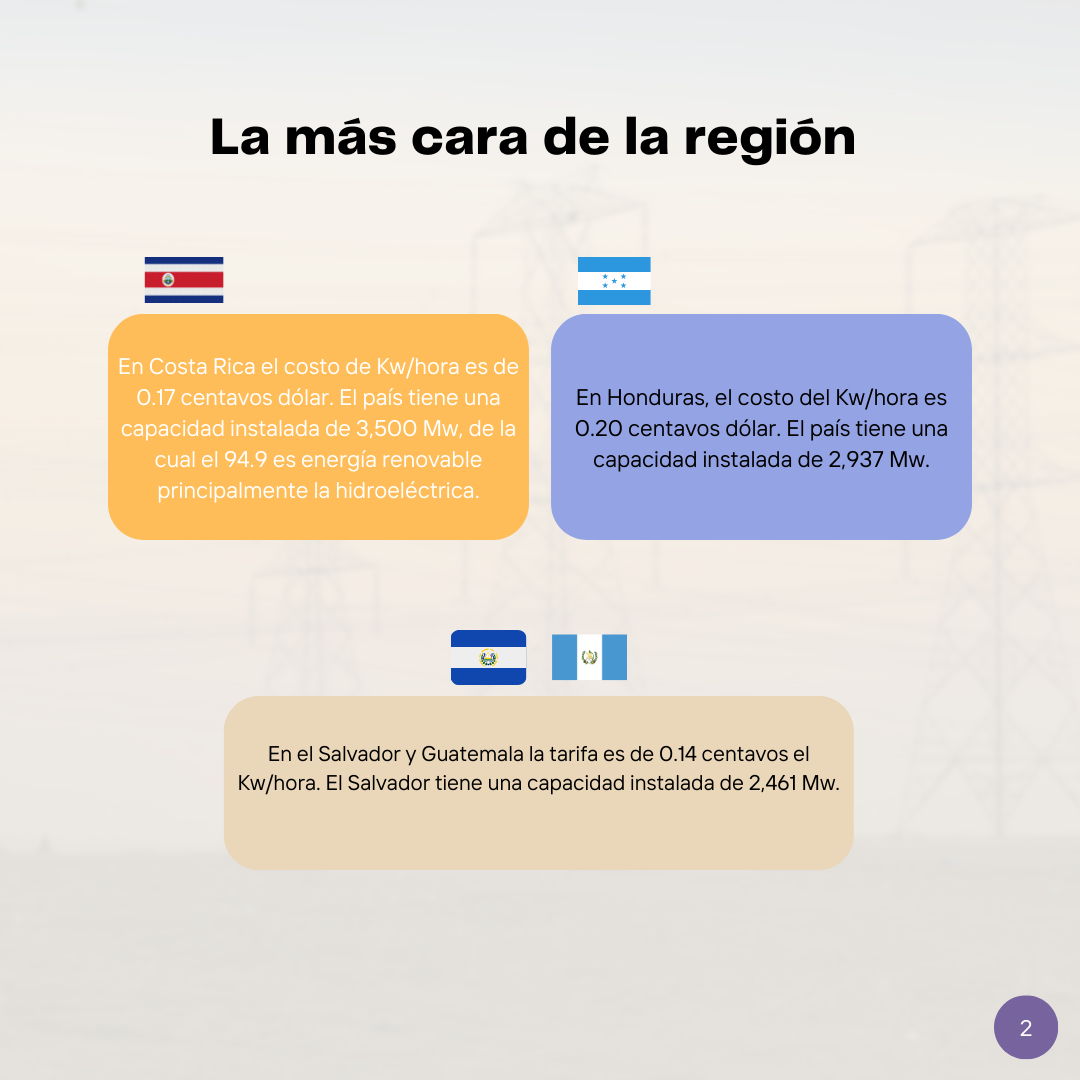 Los costarricenses pagan 0.17 dólares por kWh. En el caso de El Salvador y Guatemala, la tarifa es de 0.14 dólares por kWh. El Salvador, con una capacidad instalada de 2,461 MW, incluso ha logrado generar ingresos por más de 40 millones de dólares gracias a la venta de energía a otros países.