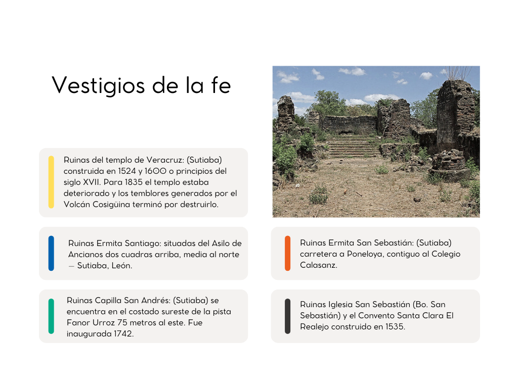 En la ciudad Santiago de Los Caballeros, los colonizadores dejaron sus huellas. Su arquitectura urbanística con el mismo trazado de León Viejo como sus calles y templos. En el Pueblo Indígena de Sutiaba, se encuentran las ruinas de Veracruz y sus cuatro ermitas primitivas. El sitio que forma parte de la memoria histórica de León de Nicaragua se borró con los años. Los habitantes denuncian que las ruinas se encuentran en estado de “abandono” ante la falta de mantenimiento y olvido de las autoridades.