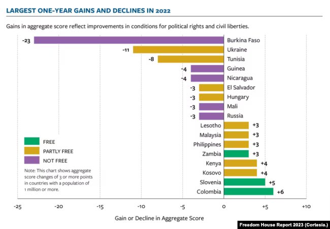 Los aumentos estuvieron impulsados «por elecciones más competitivas, así como por una reversión de las restricciones relacionadas con la pandemia que habían afectado de manera desproporcionada la libertad de reunión y la libertad de movimiento», reveló Freedom House.