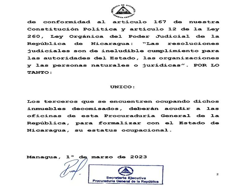 “Los terceros que se encuentren ocupando dichos inmuebles decomisados, deberán acudir a las oficinas de esta Procuraduría General de la República, para formalizar con el Estado de Nicaragua, su estatus ocupacional”, informó la PGR en una nota de prensa publicada este miércoles 1 de marzo.