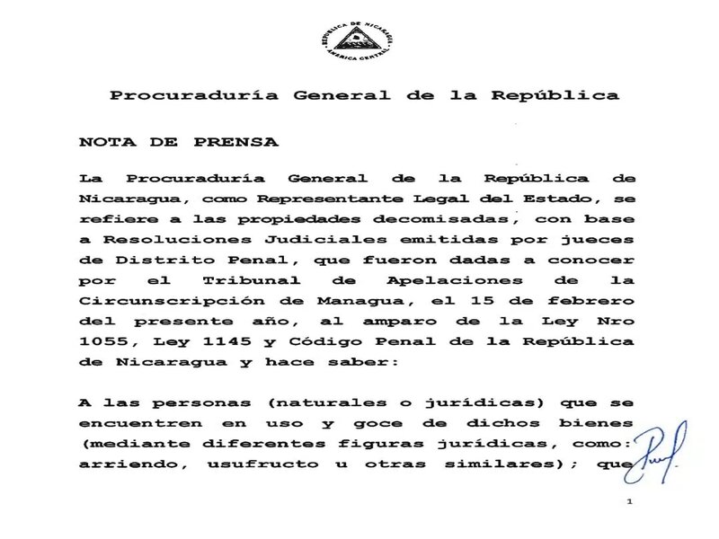 “La Procuraduría General de la República de Nicaragua, como representante legal del Estado, se refiere a las propiedades decomisadas, con base a resoluciones judiciales emitidas por jueces de Distrito Penal, que fueron dadas a conocer por el Tribunal de Apelaciones de la Circunscripción de Managua, el 15 de febrero del presente año”, detalló.
