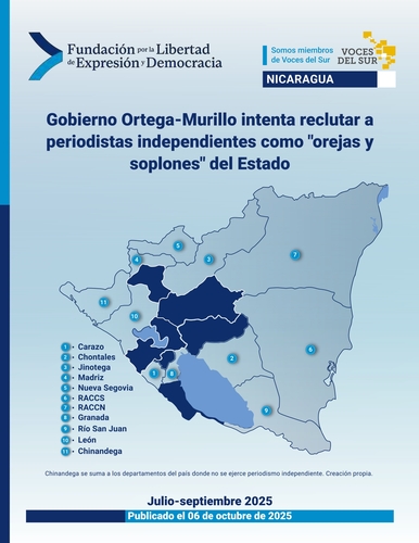 El gobierno de Daniel Ortega y Rosario Murillo ha intensificado las presiones contra periodistas independientes en Nicaragua, recurriendo a amenazas, hostigamiento y chantaje para obligarlos a convertirse en informantes de las estructuras oficialistas. Así lo documenta la Fundación por la Libertad de Expresión y Democracia (FLED) en su III Informe Trimestral 2025, correspondiente al periodo julio–septiembre, en el que se registraron 31 casos de agresiones y ataques contra la prensa independiente.