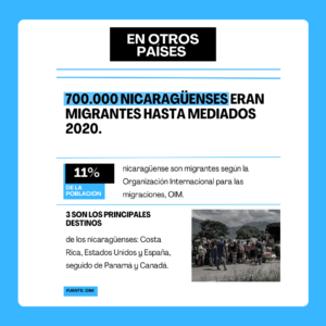 De acuerdo con la Organización Internacional para las Migraciones (OIM) más de 700 mil nicaragüenses eran migrantes hasta mediados del 2020, lo que equivale a casi el 11% de la población que vive en Nicaragua. Sin embargo, ese número no incluye datos registrados por los principales países receptores de migrantes nicaragüenses y tampoco datos de personas que emigran de manera irregular.