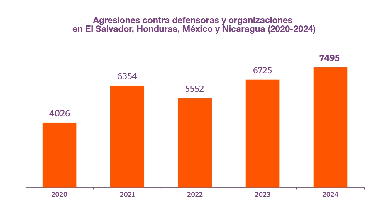 La Iniciativa Mesoamericana de Mujeres Defensoras de Derechos Humanos (IM-Defensoras) documentó durante 2024 un total de 7,495 agresiones contra defensoras de derechos humanos en El Salvador, Honduras, México y Nicaragua. Estas agresiones afectaron a 585 defensoras de derechos humanos y 93 de sus organizaciones.