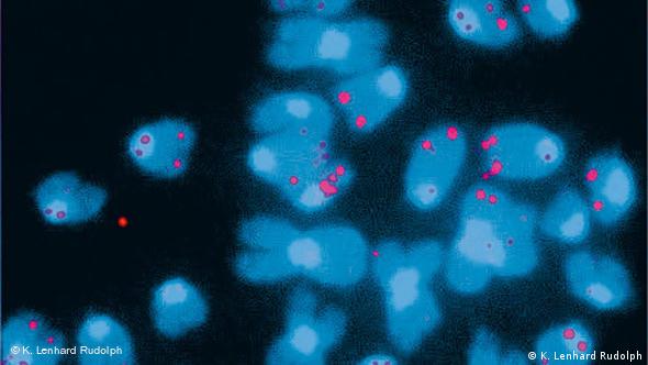Los telómeros (coloreados en rojo) forman los extremos de los cromosomas. Cuando los humanos envejecen, se acortan.