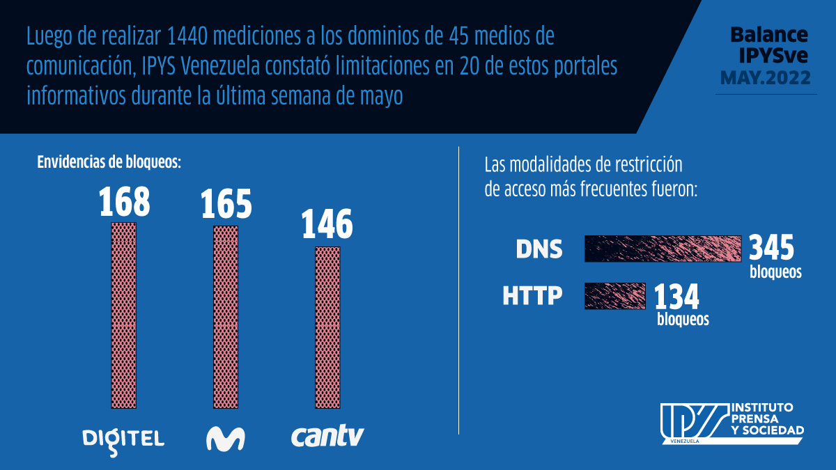Los bloqueos a los portales informativos en Venezuela continuaron aplicándose de forma constante durante el quinto mes del año. Así lo pudo comprobar el equipo de monitoreo del IPYS Venezuela a partir de 1.440 mediciones realizadas a través de la metodología del Observatorio Abierto de Interferencias en la Red (OONI Run), a 45 medios de comunicación nacionales e internacionales y sus dominios alternos, así como a redes sociales y páginas de organizaciones de la sociedad civil (OSC), entre el lunes 23 y el viernes 27 de mayo.