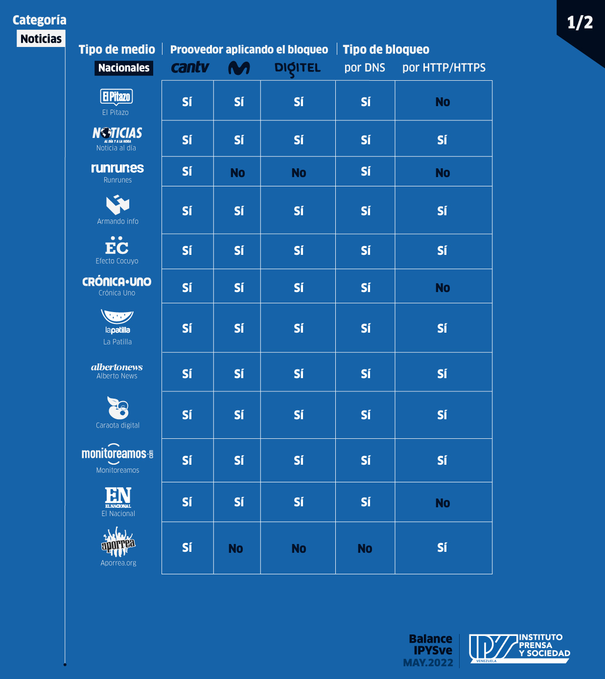 Los medios nacionales Armando.info, Efecto Cocuyo, La Patilla, AlbertoNews, Caraota Digital, Noticia al Día y Monitoreamos aparecieron bloqueados en 31 ocasiones cada uno desde las tres operadoras. Luego se ubicaron El Pitazo, Crónica Uno y El Nacional con restricciones en 21 oportunidades para cada portal. Aporrea y Runrunes completaron esta lista con 10 y una prueba de bloqueo, respectivamente.
