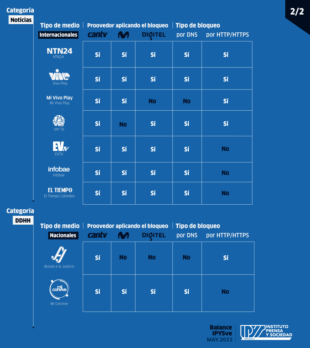 En el caso de los medios internacionales y las OSC, la lista de evidencias de impedimentos estuvo encabezada por NTN24 (31) y Vivo Play (30), medio que también sufre limitaciones de acceso a través de su dominio alterno Mi Vivo Play, el cual registró 15 episodios de censura bajo la modalidad HTTP que se constataron en CANTV y Movistar. Los otros portales que arrojaron interrupciones fueron VPItv (21), Infobae (21), EVTV (20), El Tiempo de Colombia (20), y las organizaciones Mi Convive (21) y Acceso a la Justicia (9).