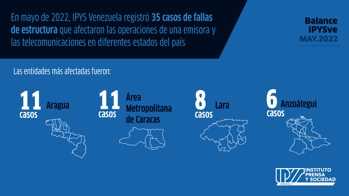 Las fallas de estructura también persistieron en mayo. Durante este tiempo el IPYS Venezuela constató 35 casos que afectaron las telecomunicaciones en el país y las operaciones de una emisora radial. De acuerdo con el registro, 21 de los hechos fueron causados por incidentes desconocidos, mientras que siete fueron producto de apagones o cortes eléctricos y otros siete, por cortes de fibra óptica. Las entidades más afectadas por estos incidentes fueron el Área Metropolitana de Caracas y el estado Aragua, con 11 sucesos cada una, seguidas por Lara (8) y Anzoátegui (6).