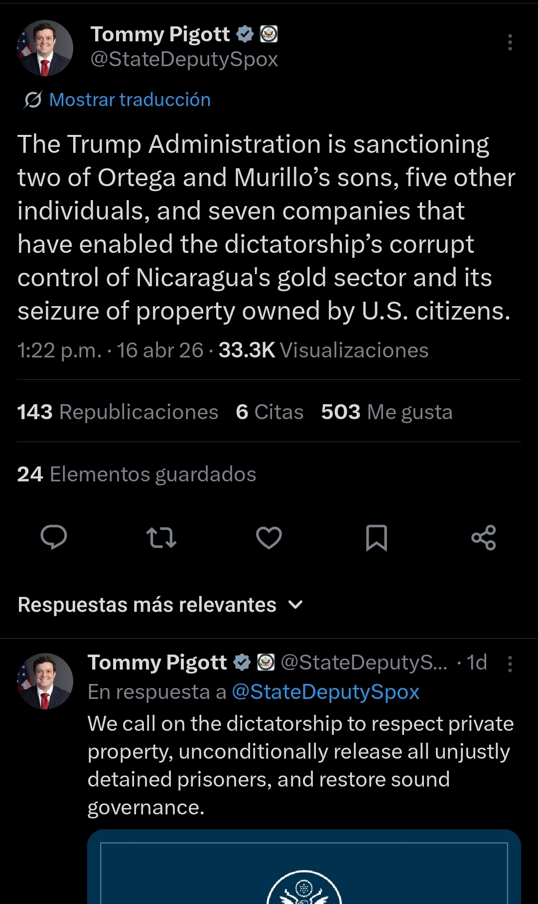 El regimen criminal sandinista de los ancianos del carmen ,esta jugando piernas y dando falsos positivos,juegos mediaticos pero no ha resuelto ninguno de los casos en los cuales EEUU les exige repuesta inmediata a la dictadura sandinista,ya con estas sanciones mas las otras que vienen para afixiar al regimen ,estariamos hablando que su salida es inminente,no hay vuelta atras y los periodos cruciales son de mayo a octubre 2026.